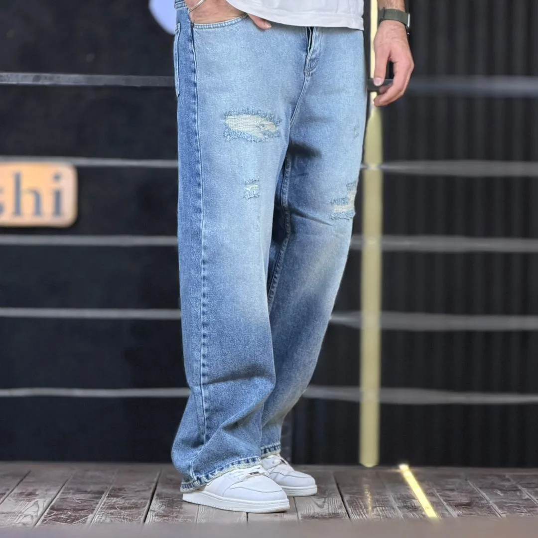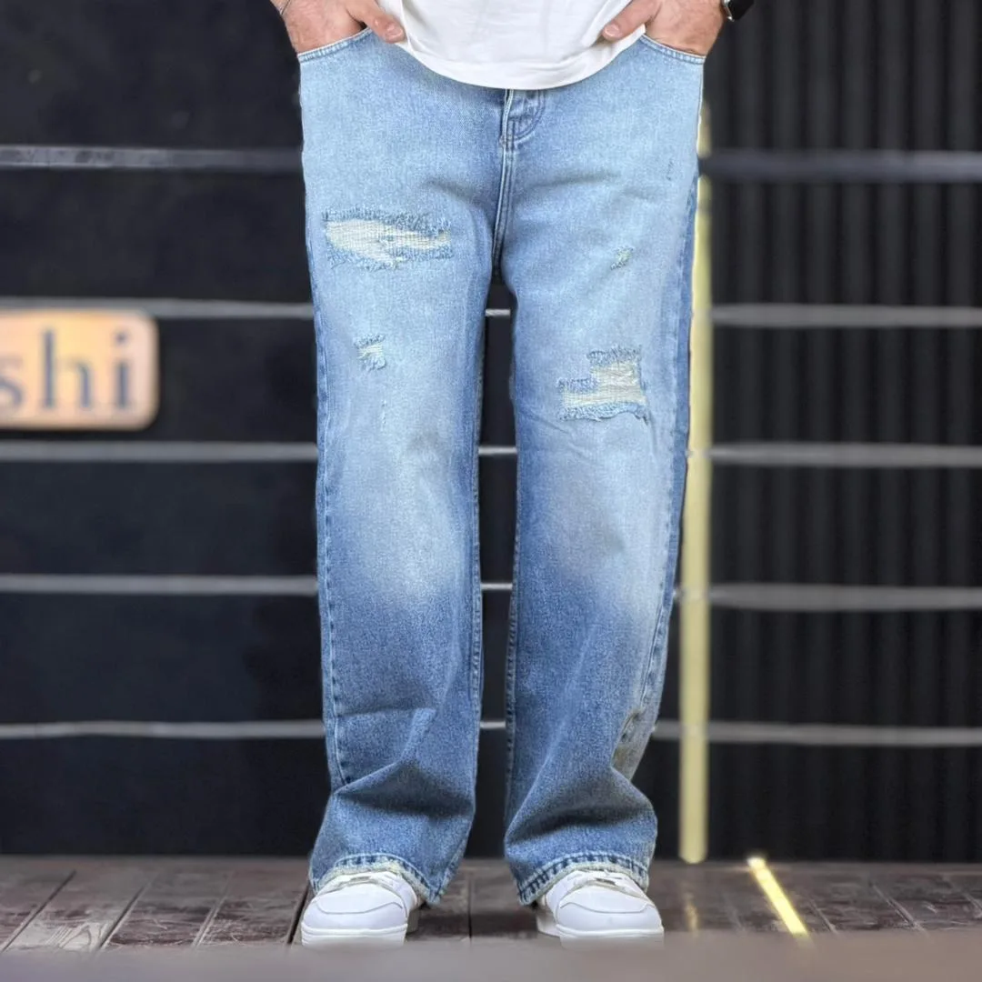 شلوار جین بگ زاپ دار دوختی آبی یخی تینت سفید 4/491