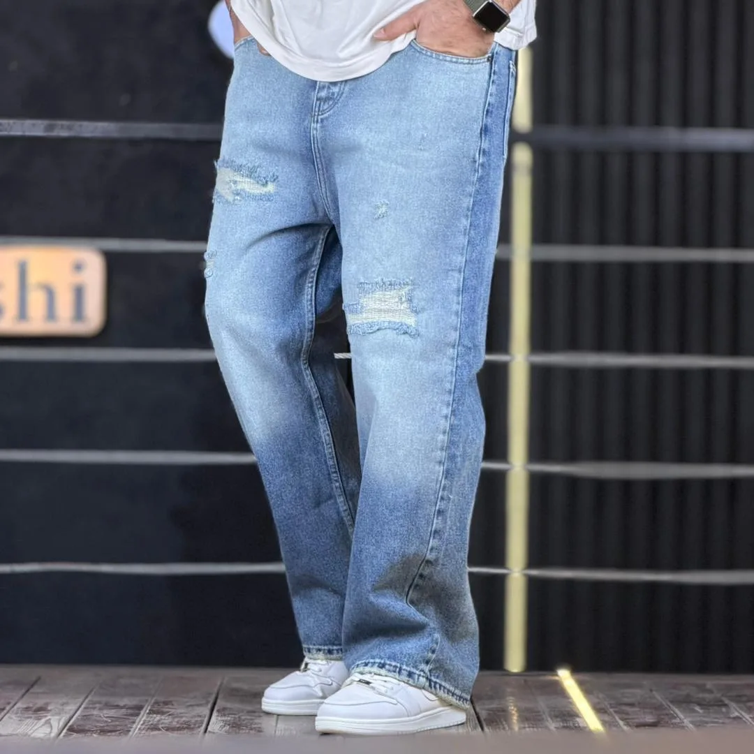 شلوار مام فیت جین مردانه زاپدار آبی یخی کد 3/545