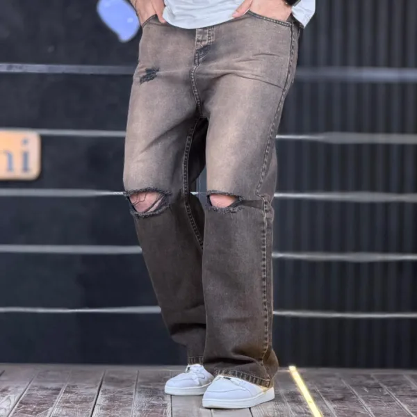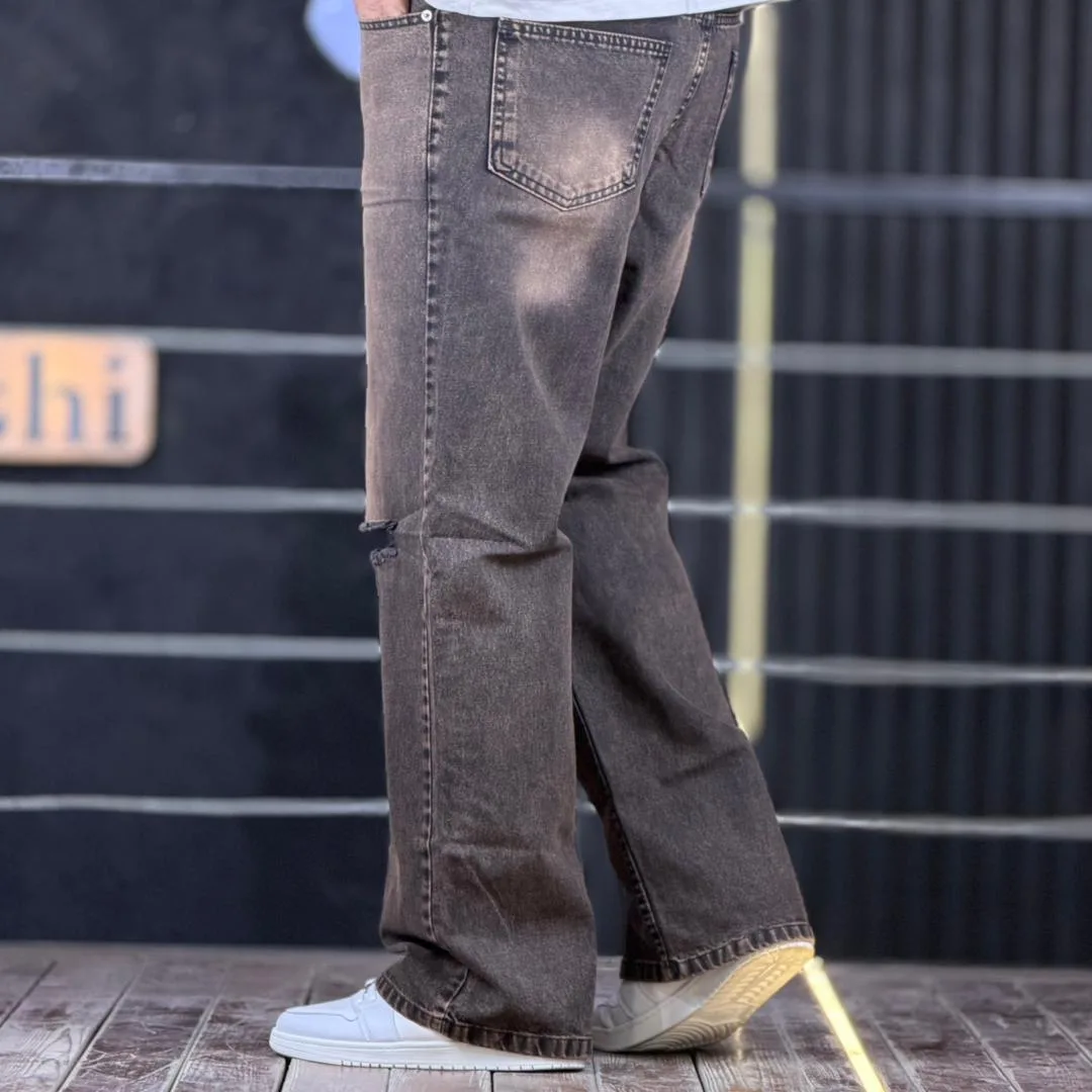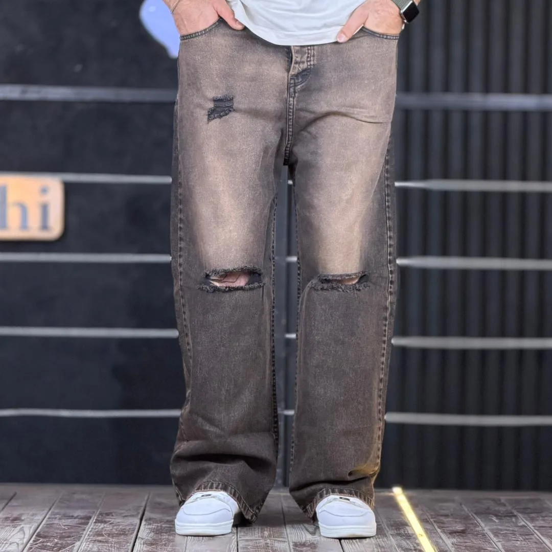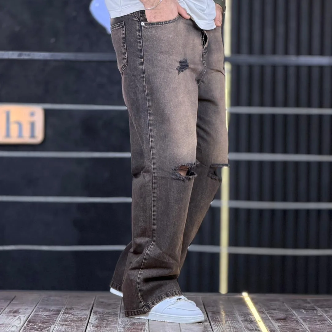 شلوار جین بگ قهوه ای تینت دار زانو زاپ 4/355