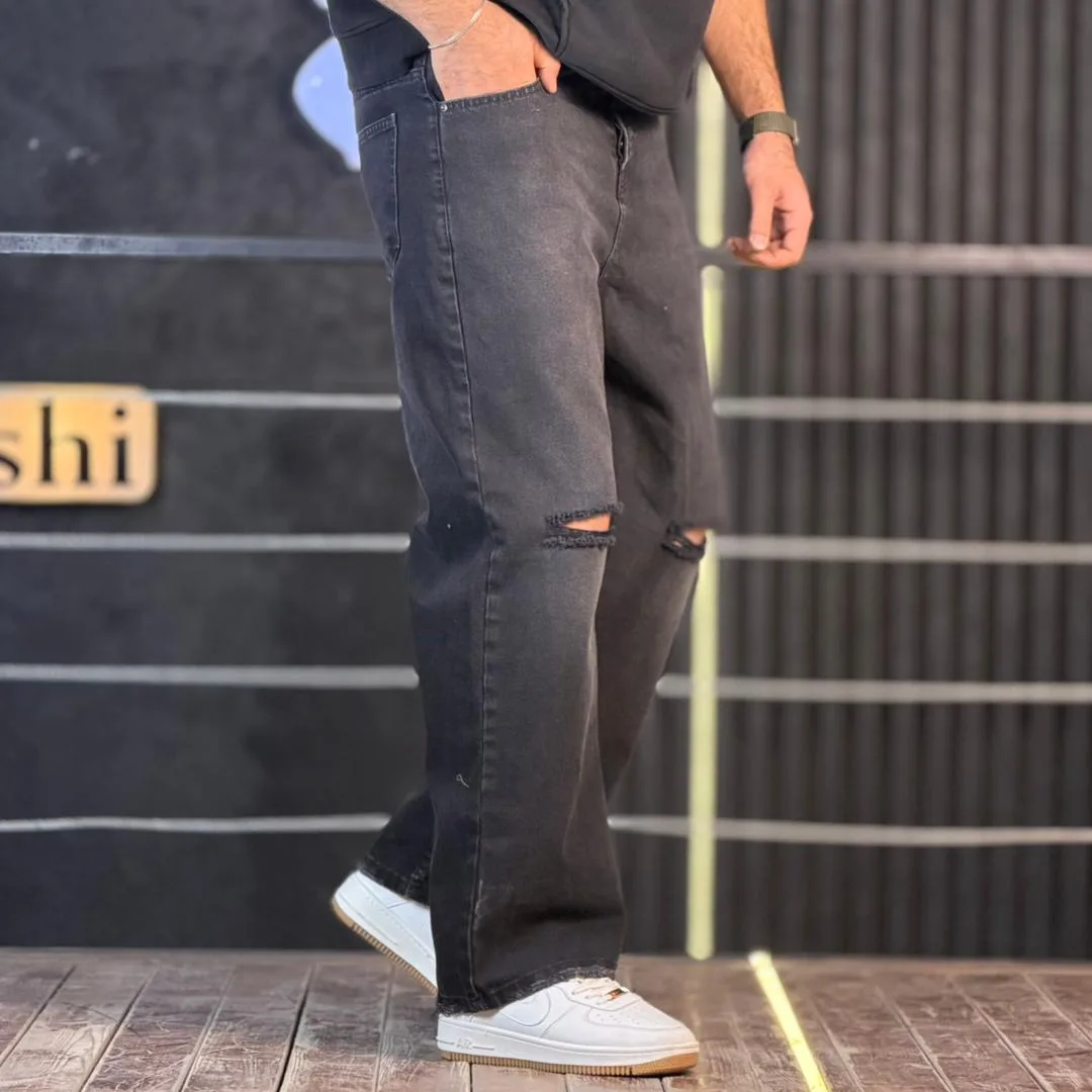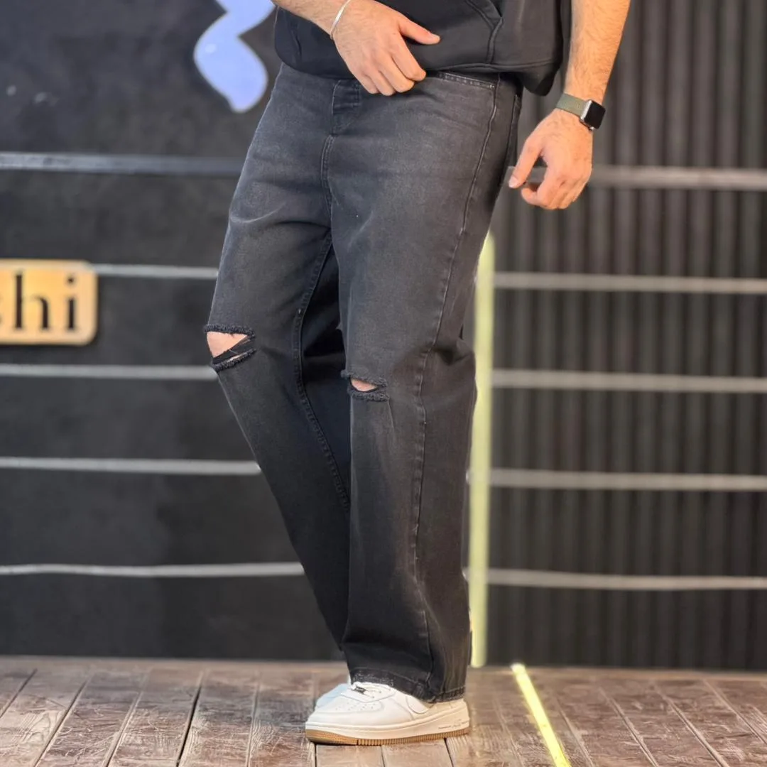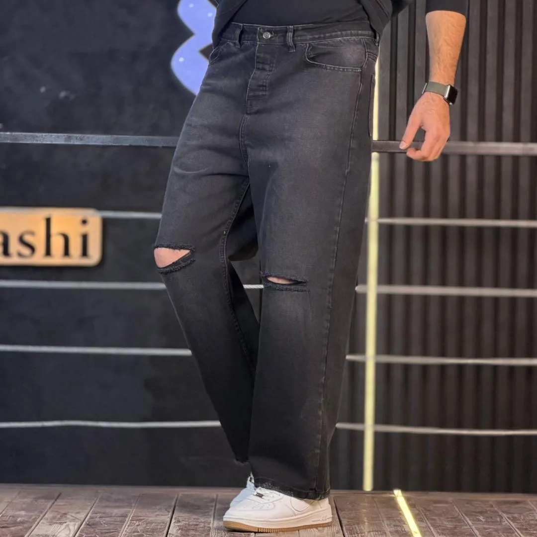 شلوار جین بگ دودی تیره زانو زاپ 4/561