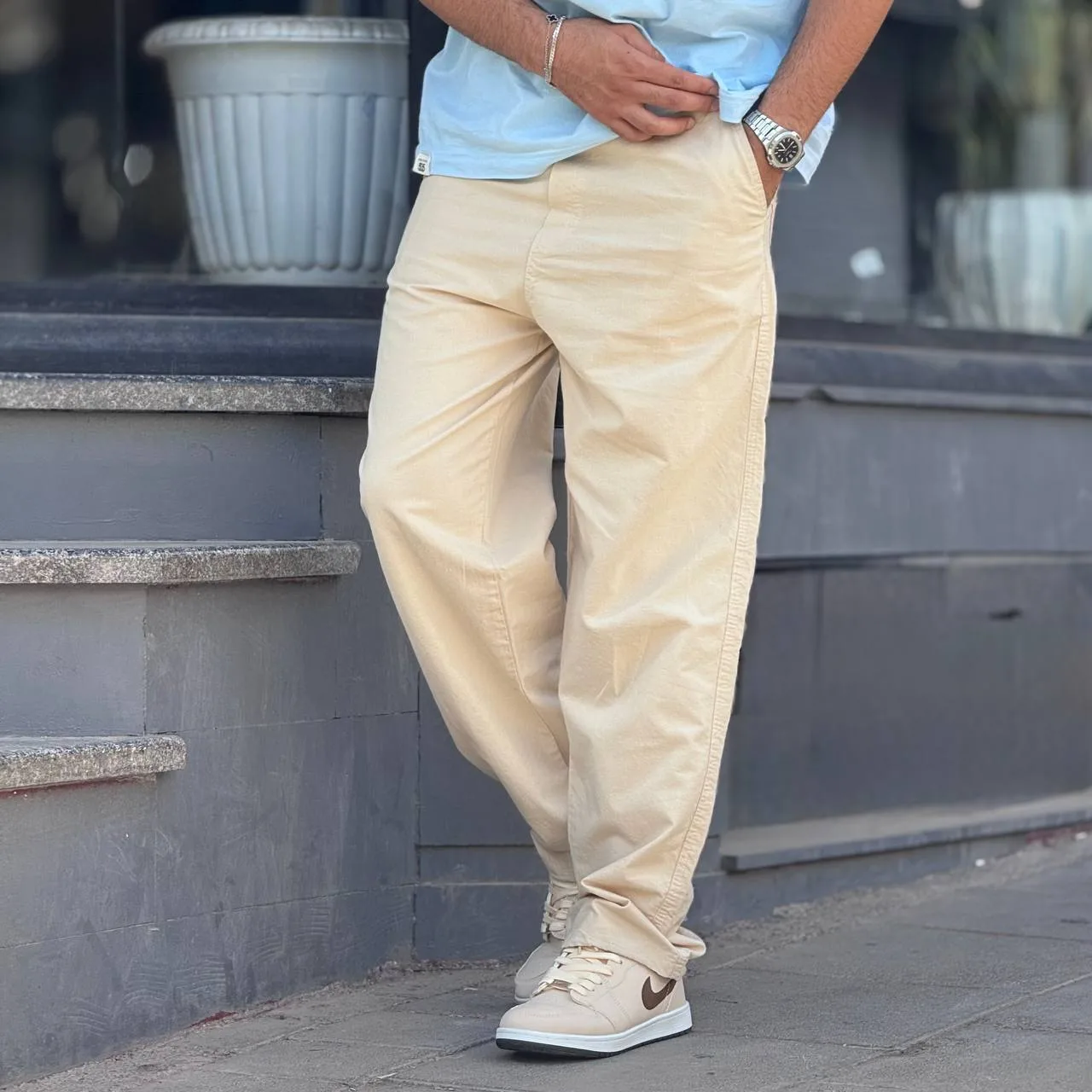 برای داشتن استایلی مینیمال و مدرن، این شلوار را با یک تیشرت نخی ساده یا پیراهن لینن (کتانی) ست کنید. استفاده از کفشهای کالج، صندل یا کتانیهای سفید میتواند تکمیلکننده این استایل خنک و راحت باشد. عینک آفتابی و کیف کراسبادی هم میتواند به استایل تابستانی شما جلوه بیشتری بدهد.