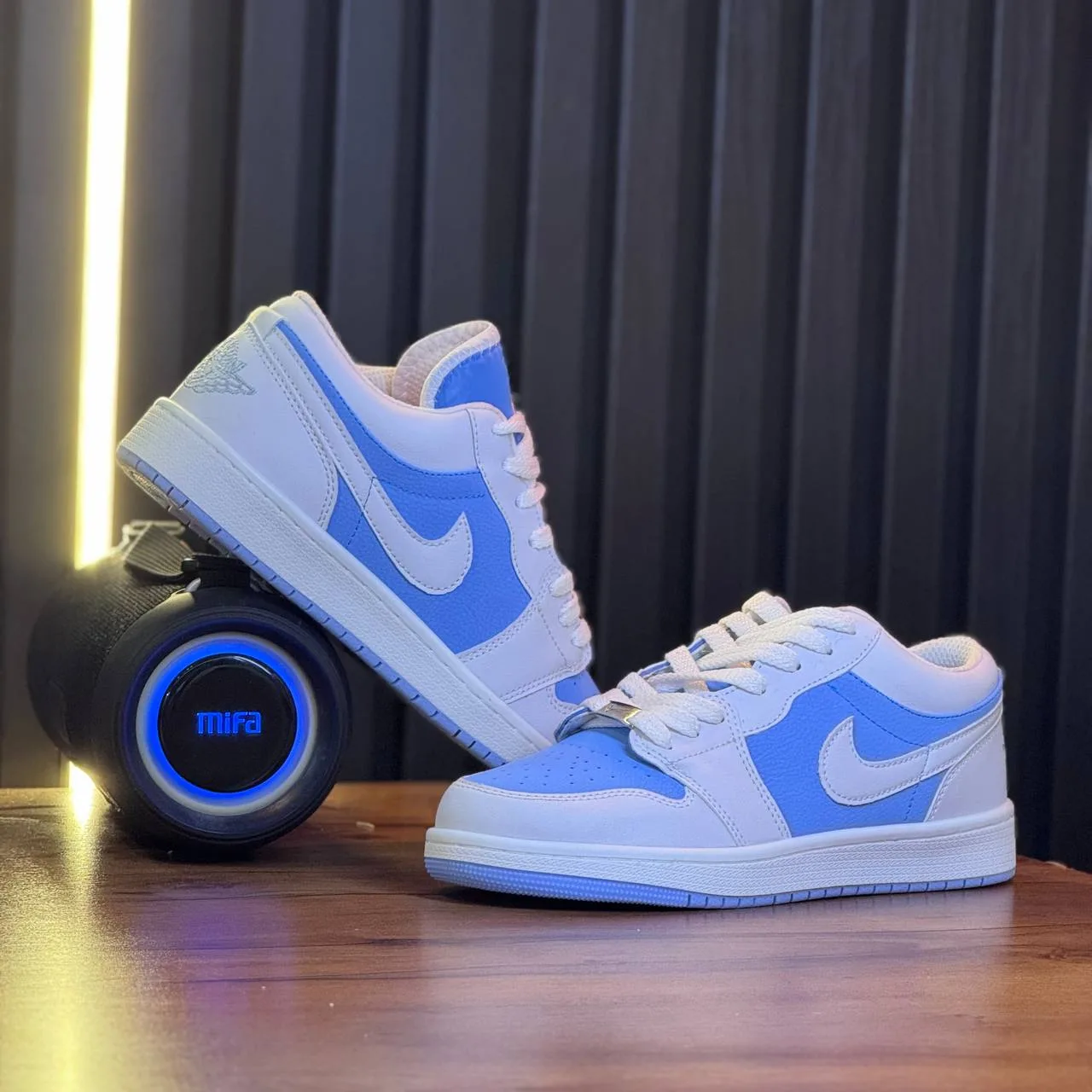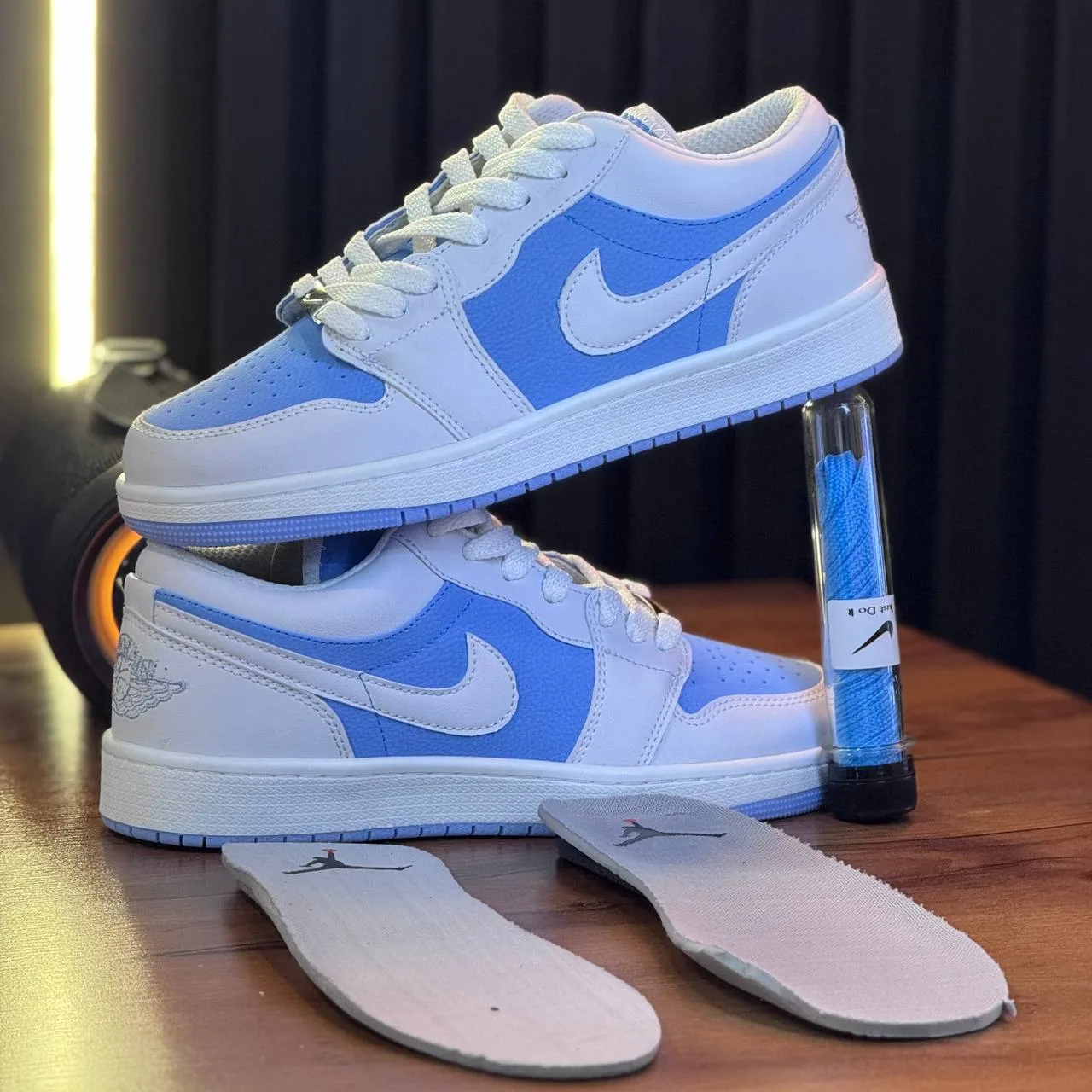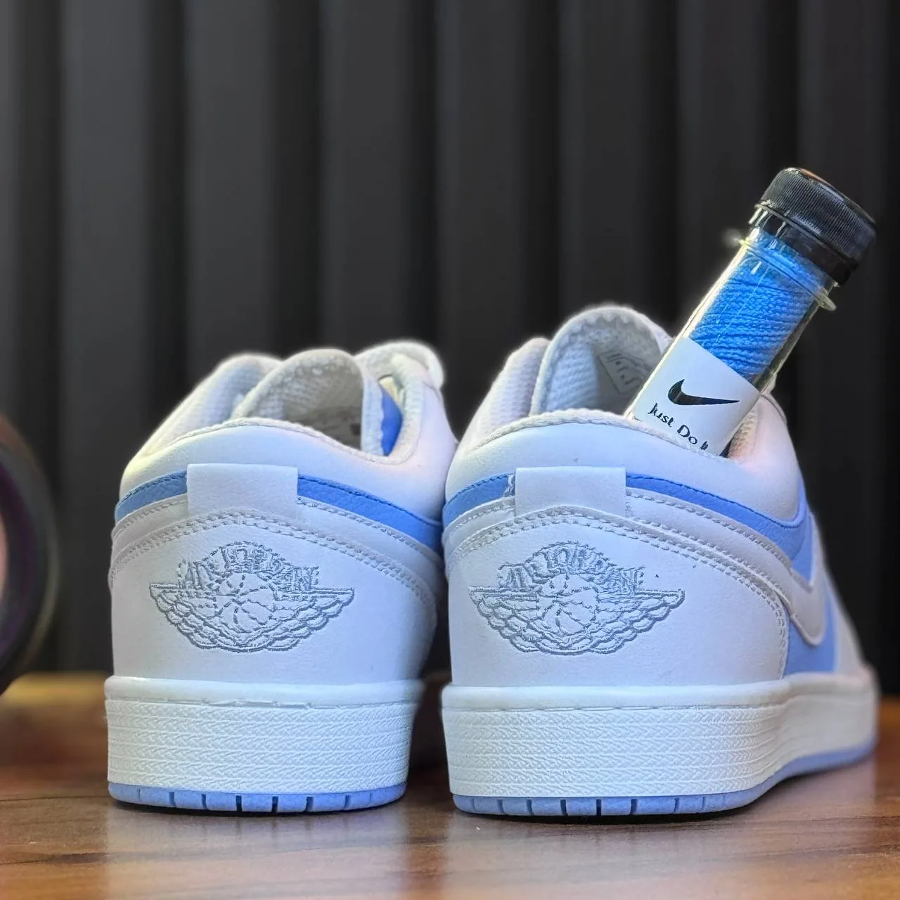 رنگ سفید در ترکیب با جزئیات آبی روشن، ظاهری تمیز و مینیمال به کفش داده که آن را برای استفاده در فصلهای بهار و تابستان ایدهآل میکند. طراحی کلاسیک بدنهی این مدل با لوگوی معروف Air Jordan و فرم ساقکوتاه، اصالت و سبک را در کنار هم قرار داده است.