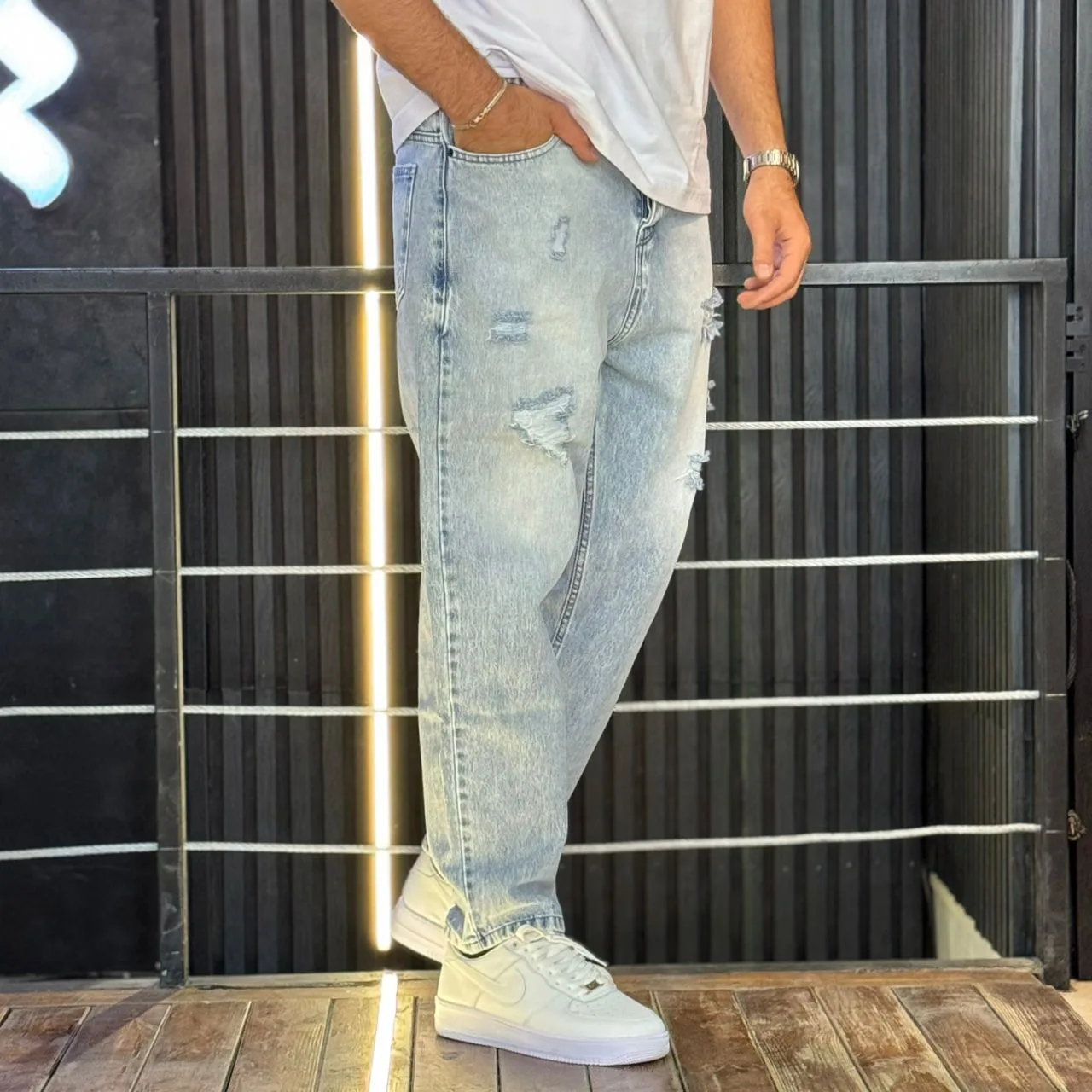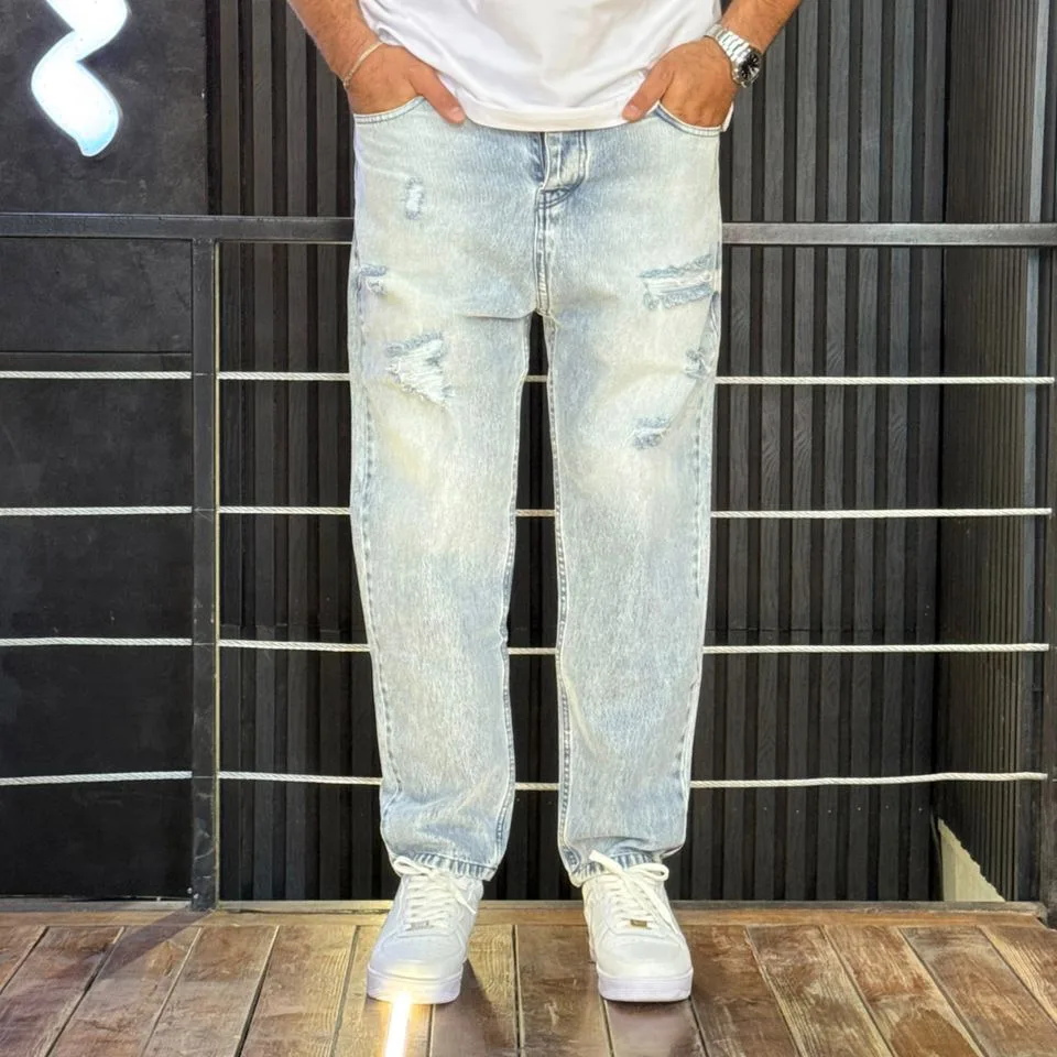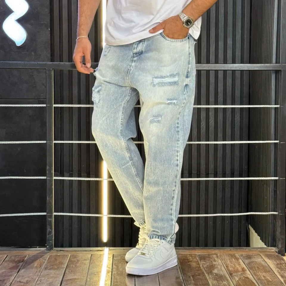 شلوار مام فیت جین مردانه زاپدار آبی یخی کد 3/545