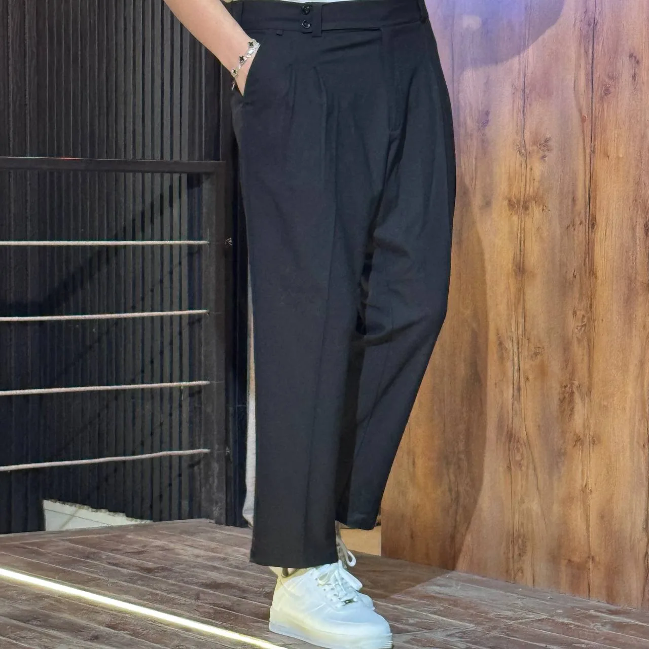 - طراحی مام فیت: آزاد در قسمت ران و باریک به سمت مچ پا، که به فرم بدن جلوهای متعادل و شیک میدهد.